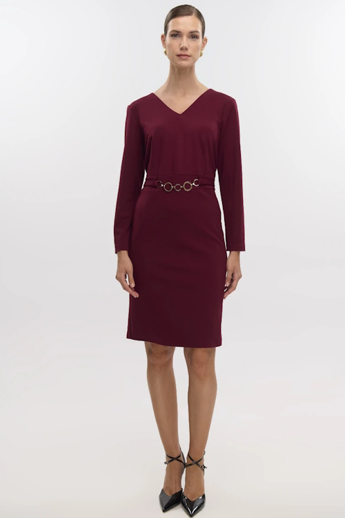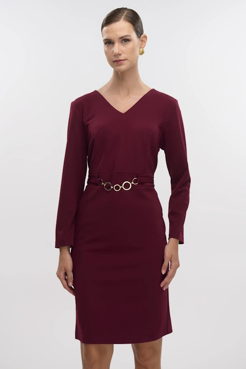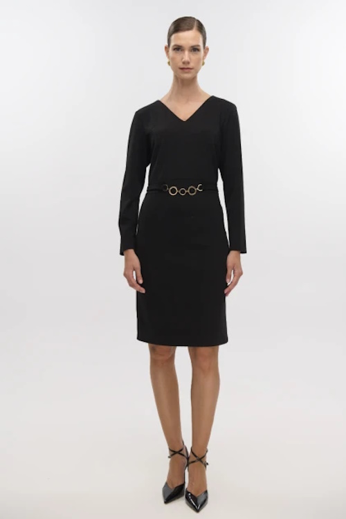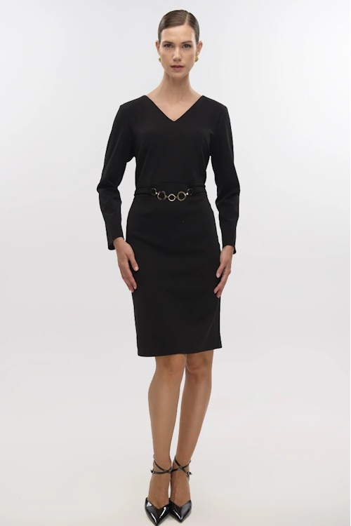 Φόρεμα σε ύφασμα κρεπ με V λαιμόκοψη, διακοσμητική αλυσίδα στη μέση, μακρύ μανίκι, κλείσιμο με κρυφό φερμουάρ και φοδραρισμένο.