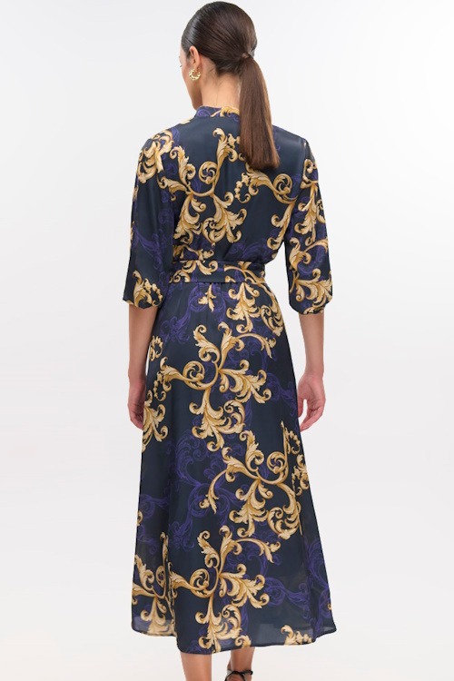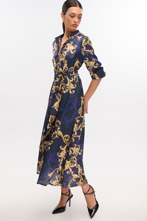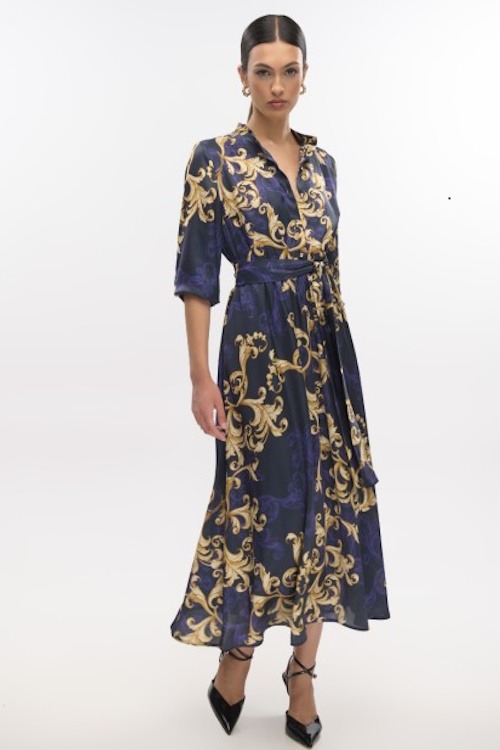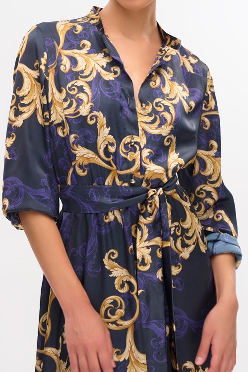 Φόρεμα σε ύφασμα σατέν εμπριμέ με κουμπιά στο πάνω μέρος, μακρύ μανίκι με μανσέτα, ελαστική μέση και ζώνη από το ίδιο ύφασμα, φοδραρισμένο για καλύτερη εφαρμογή.